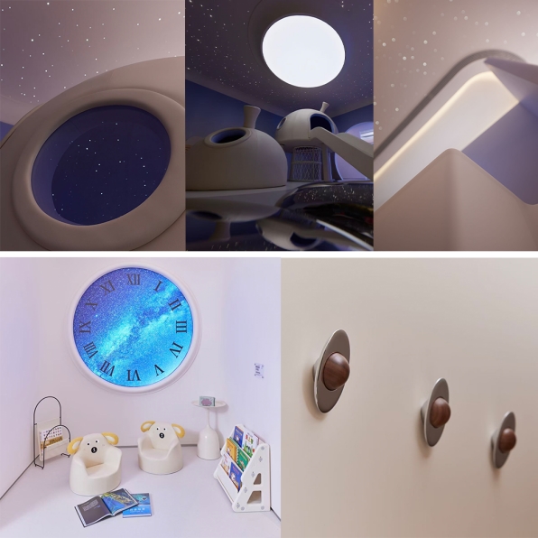 圍繞“太空旅程”主題,母嬰室內(nèi),驚喜細(xì)節(jié)俯拾皆是。從星空頂、“太空舷窗”、還有飛行器造型的兒童滑梯,甚至飛碟形狀的掛衣鉤,這個(gè)空間,不止是一個(gè)應(yīng)急之所,更是驚喜的去處。