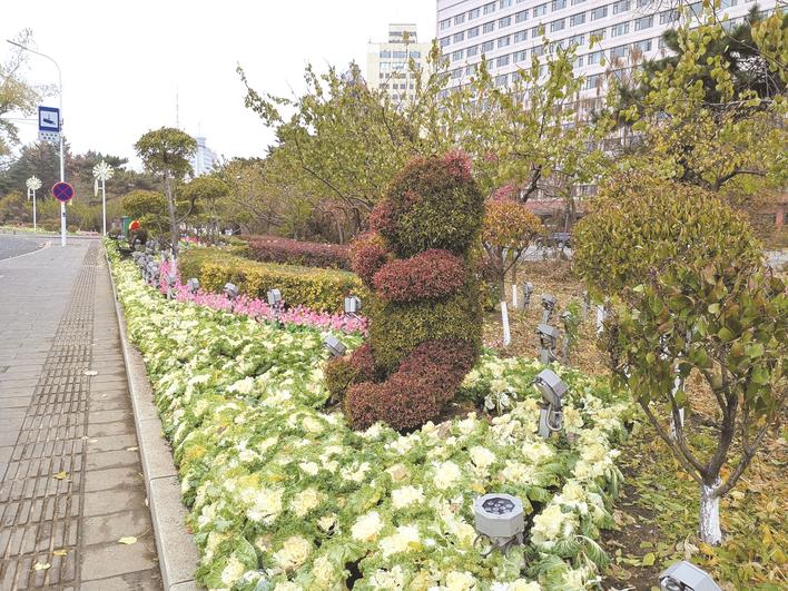 10月31日,在長春市新民廣場附近,雖然秋風正掃落葉,但路旁的花卉依然色彩鮮艷、景色宜人,顯得生機勃勃?,F場通過冷暖花色的有機組合,以簡約明快的線條和圖形組成各種層次豐富、靈動多彩的圖案,有漂亮的“孔雀”、呆萌的“小熊”、高高的“蘑菇”……