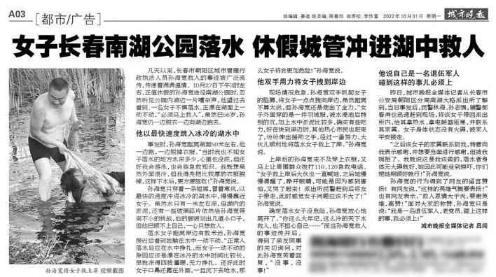 10月27日下午3時左右,正在休假期間的孫海寬忽然聽見南湖公園西側(cè)岸邊一片嘈雜。他發(fā)現(xiàn)一名50多歲的女性正漂在湖邊,得知落水女子已困在水中近半小時了,10月末的晚秋氣溫接近零攝氏度,孫海寬雖已56歲,但當時情況緊急,他來不及多加考慮,立即脫下衣物,冒著寒風(fēng)跳進刺骨的湖水中。
