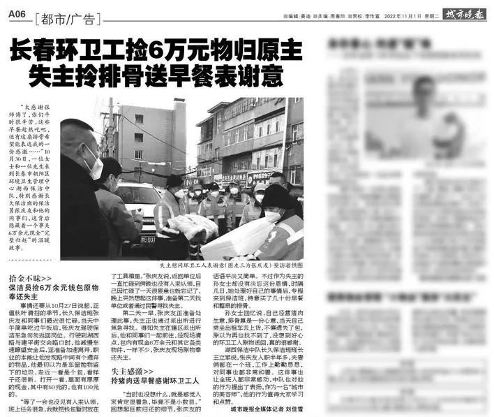 幾天后,失主專程來到湖西保潔中隊,特意買了幾十份早餐和整扇的排骨送給長久班,感謝張慶友的善舉。